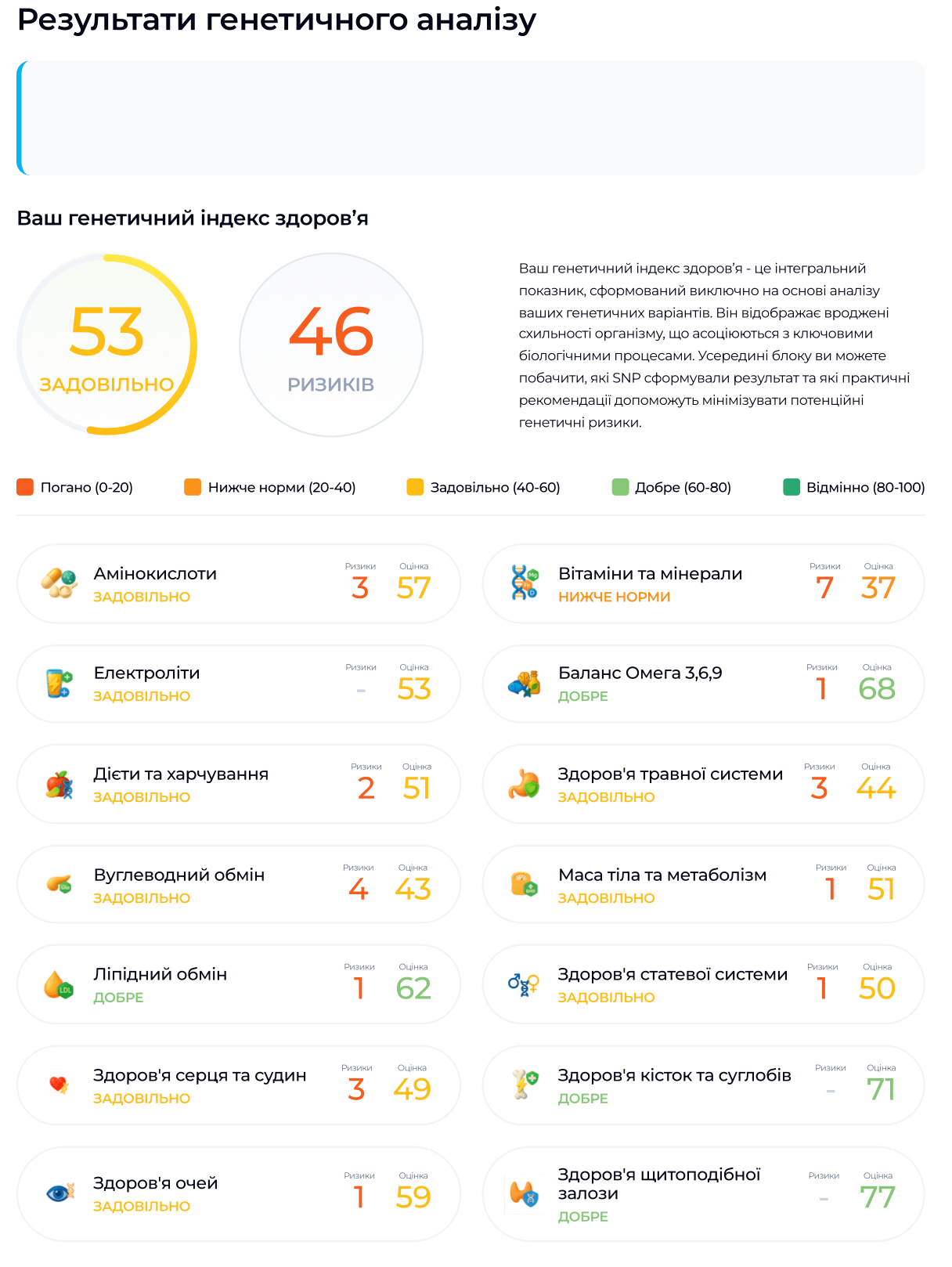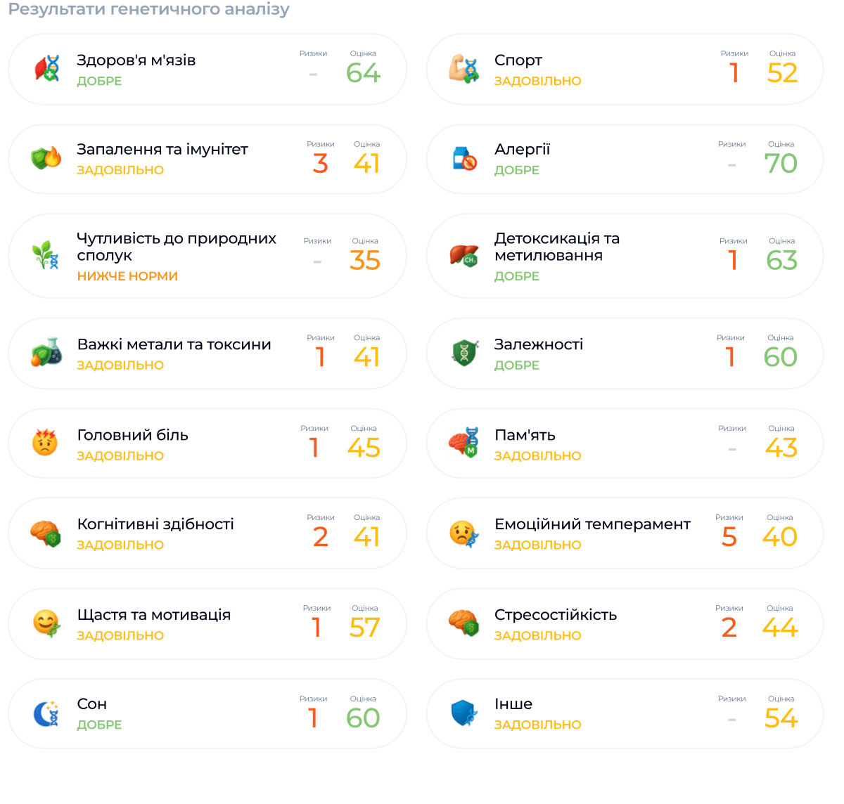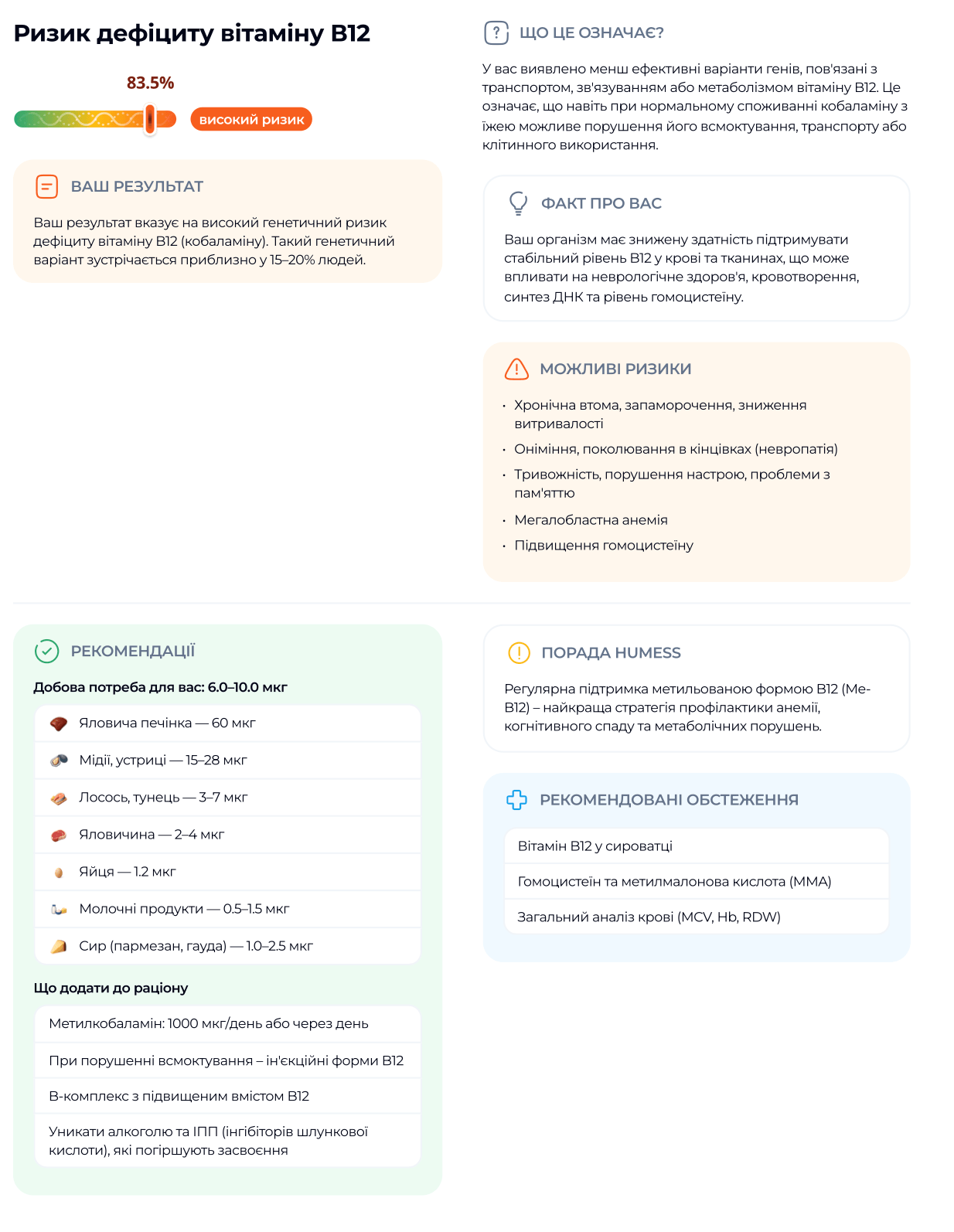 ДНК-звіт Humess — це не просто “низький / середній / високий ризик”. Це цілісна персональна інструкція, де кожен показник включає: